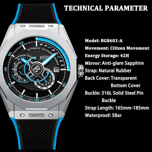 BONEST GATTI Men's Watch CITIZEN Movement Automatic Mechanical Watch Transparent Cover Roud Shaped Case Luminous 42h Rubber Strap GB9601-A
