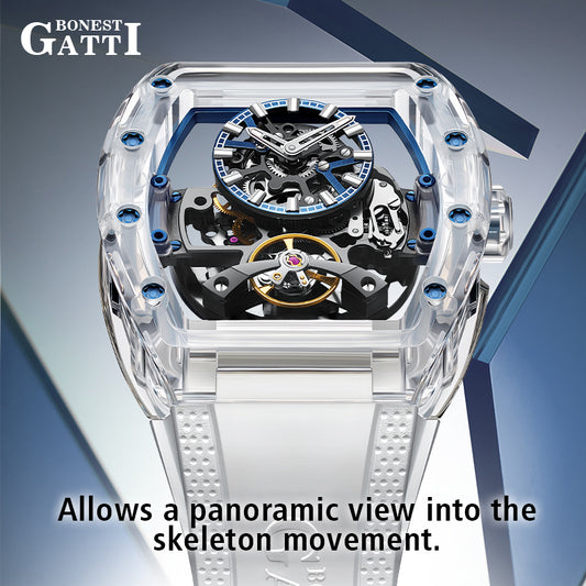 BONEST GATTI K9 Crystal Tonneau Skeleton Automatic Tourbillon Watch BG7001