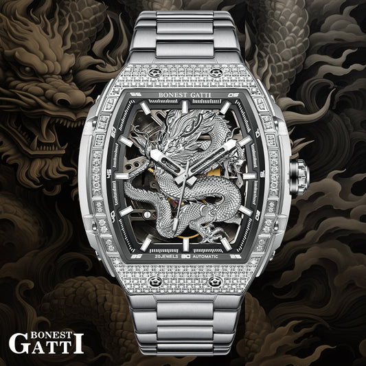 BONEST GATTI Barrel Dragon 185 Zircon Stones Bezel Stainless Steel Bracelet Men's Automatic Mechanical Watch Luminous BG5605L
