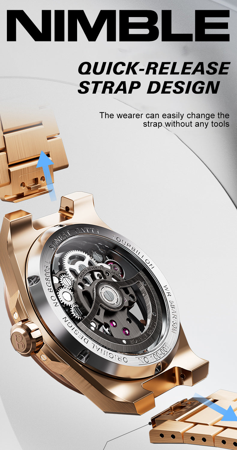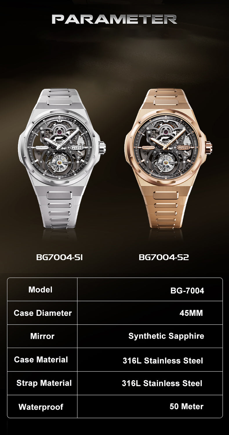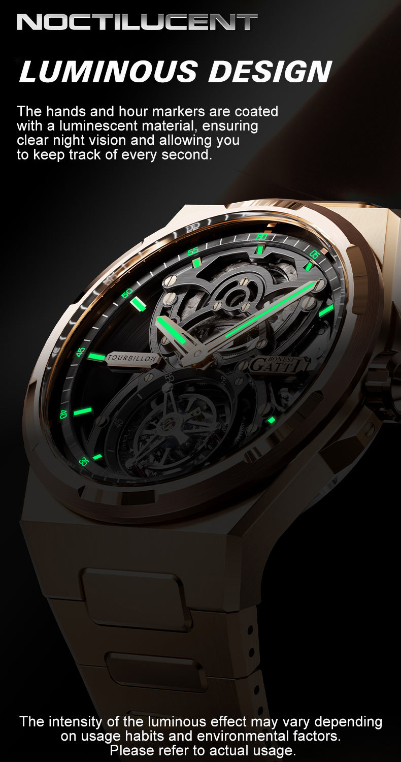 BONEST GATTI Automatic Tourbillon Watch Skeleton Self Wind 80H Power Reserve Sapphire Crystal Luminous Watch BG7004
